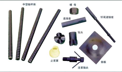 中空注浆锚杆由合金杆体、止浆塞、垫板、螺母、连接套、螺纹钢和锚头组成。
